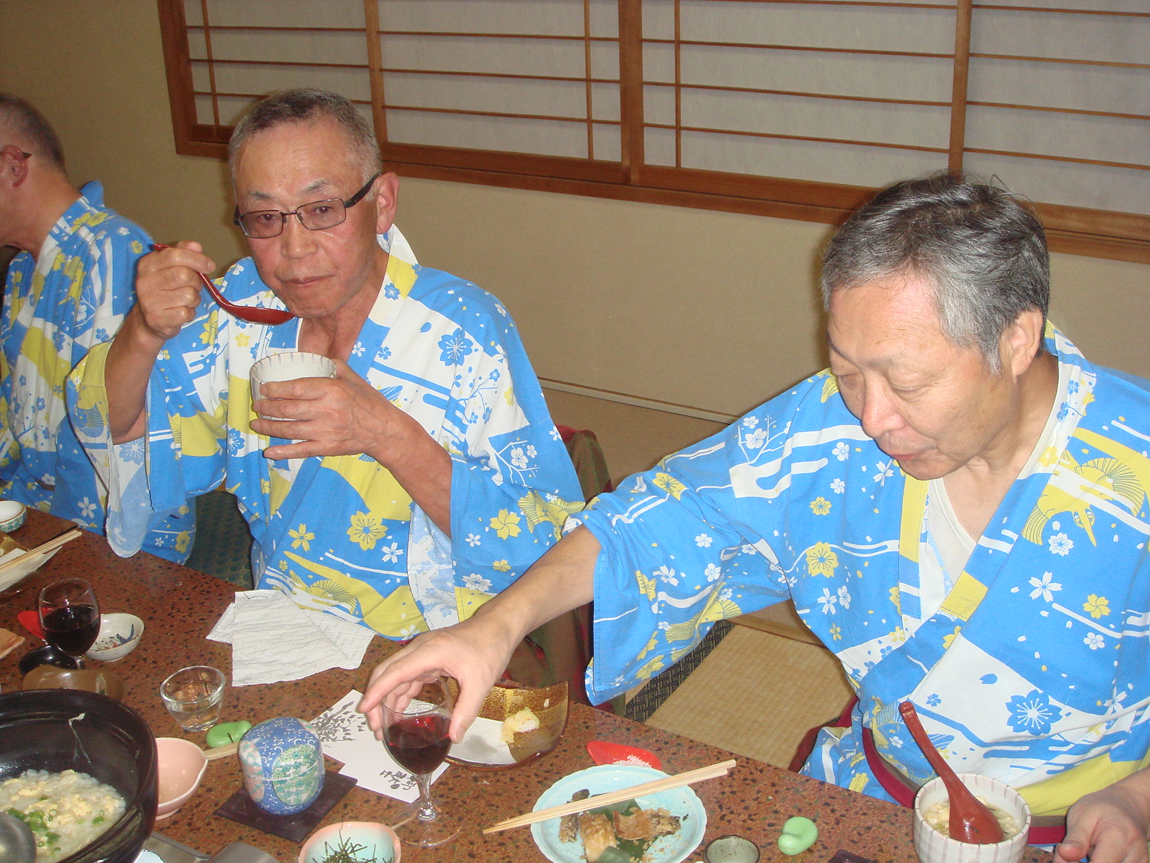 今回で14回目となるK組伝統の信州別所温泉における「松茸尽くし同級会」が、最多11名の参加を得て盛大に開催された。夕方には大阪方面から6時間かけて参加の中井・浜石両名、東京方面から8名、地元西沢の全員が宿に到着。源泉が仄かに匂う名湯に浸かった後開宴。西田君が北海道迄行って熊と遭遇しながら釣った岩魚の骨酒、京都から直送の鱧入りの松茸鍋、地酒・地ワインなどに全員大感激。至れり尽くせりの贅沢三昧。美酒に酔い痴れて夢路を辿った次第。