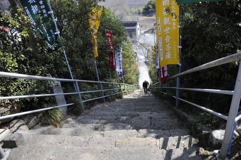 次は24番札所の「光智山法泉寺」。御詠歌「天照らす神の母祖の色かえてなおもふりぬる雪の白山」。兎に角、音楽寺からここまでが難所。まずは音楽寺からの長い下り坂を経て116段の急な階段(写真3)を上り皆へとへと。ここで既に2時近くになったので、境内で弁当を開く(写真4)ことにした。(写真5)